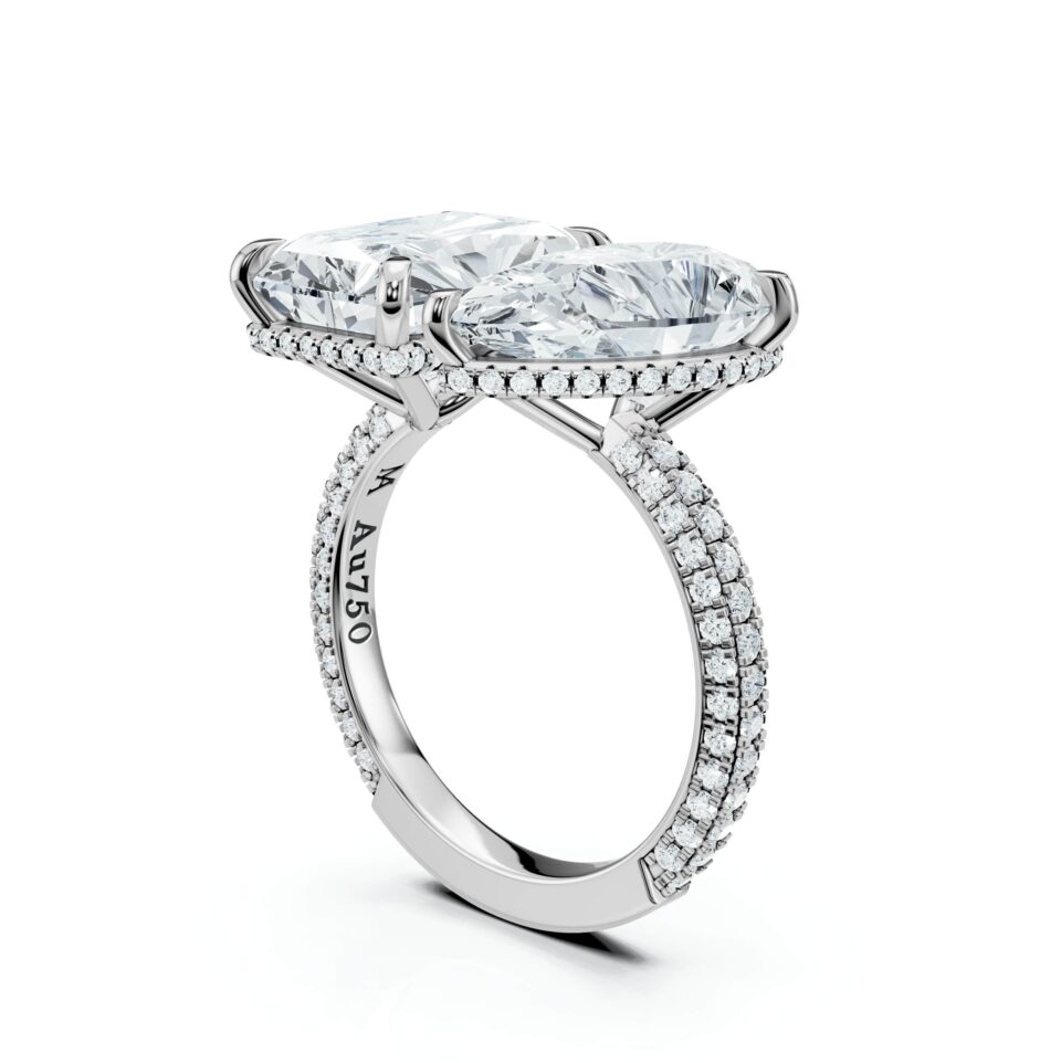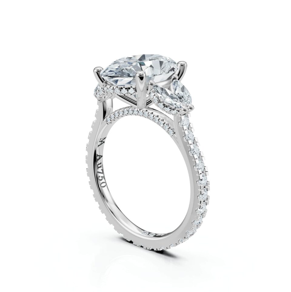 With a distinctive elongated, boat-shaped form, Marquise Diamonds maximize perceived size and flatter the hand. Its pointed ends add drama and sophistication to any setting. Usually 56 to 58 facets, designed to maximize the stone’s perceived size. Perfect for those who value distinctive style, elegance, and a desire to maximize the perceived size of their diamond.