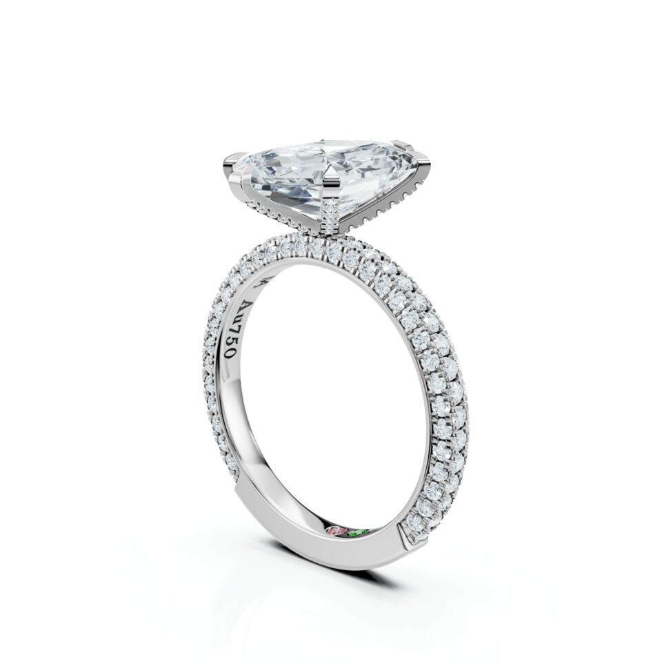 With a distinctive elongated, boat-shaped form, Marquise Diamonds maximize perceived size and flatter the hand. Its pointed ends add drama and sophistication to any setting. Usually 56 to 58 facets, designed to maximize the stone’s perceived size. Perfect for those who value distinctive style, elegance, and a desire to maximize the perceived size of their diamond.
