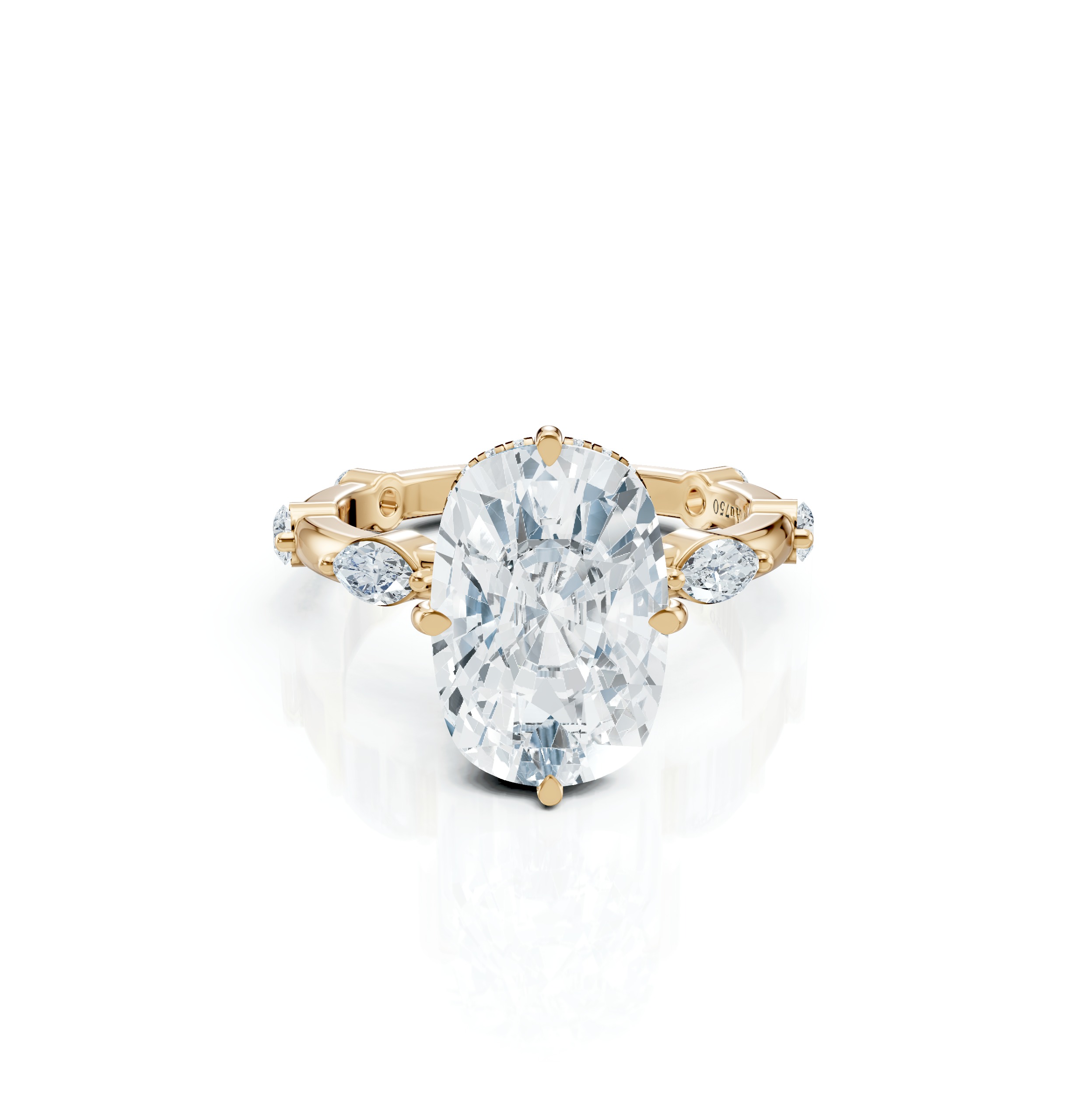 With a distinctive elongated, boat-shaped form, Marquise Diamonds maximize perceived size and flatter the hand. Its pointed ends add drama and sophistication to any setting. Usually 56 to 58 facets, designed to maximize the stone’s perceived size. Perfect for those who value distinctive style, elegance, and a desire to maximize the perceived size of their diamond.