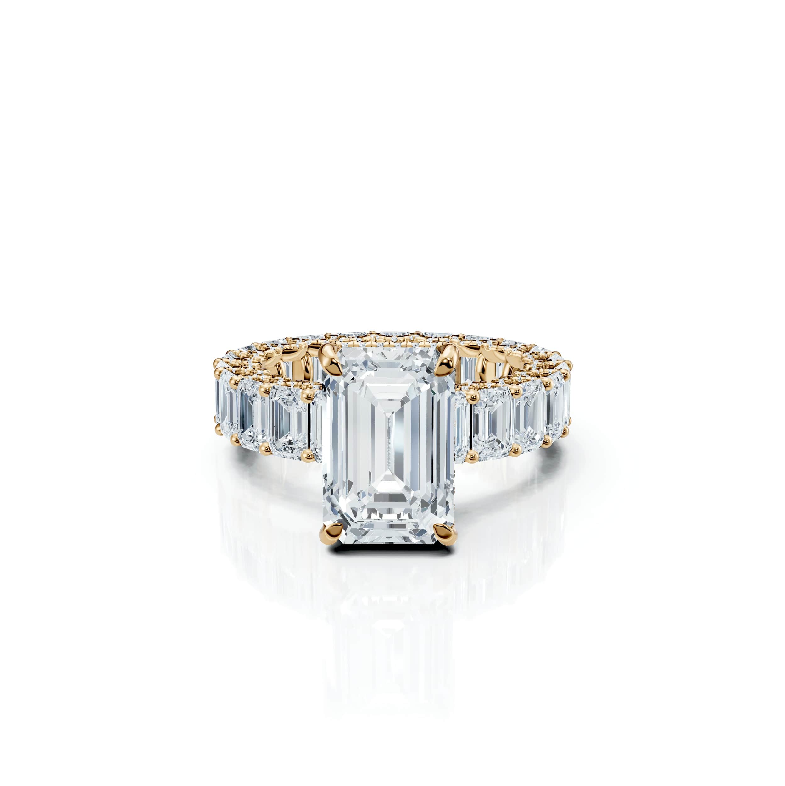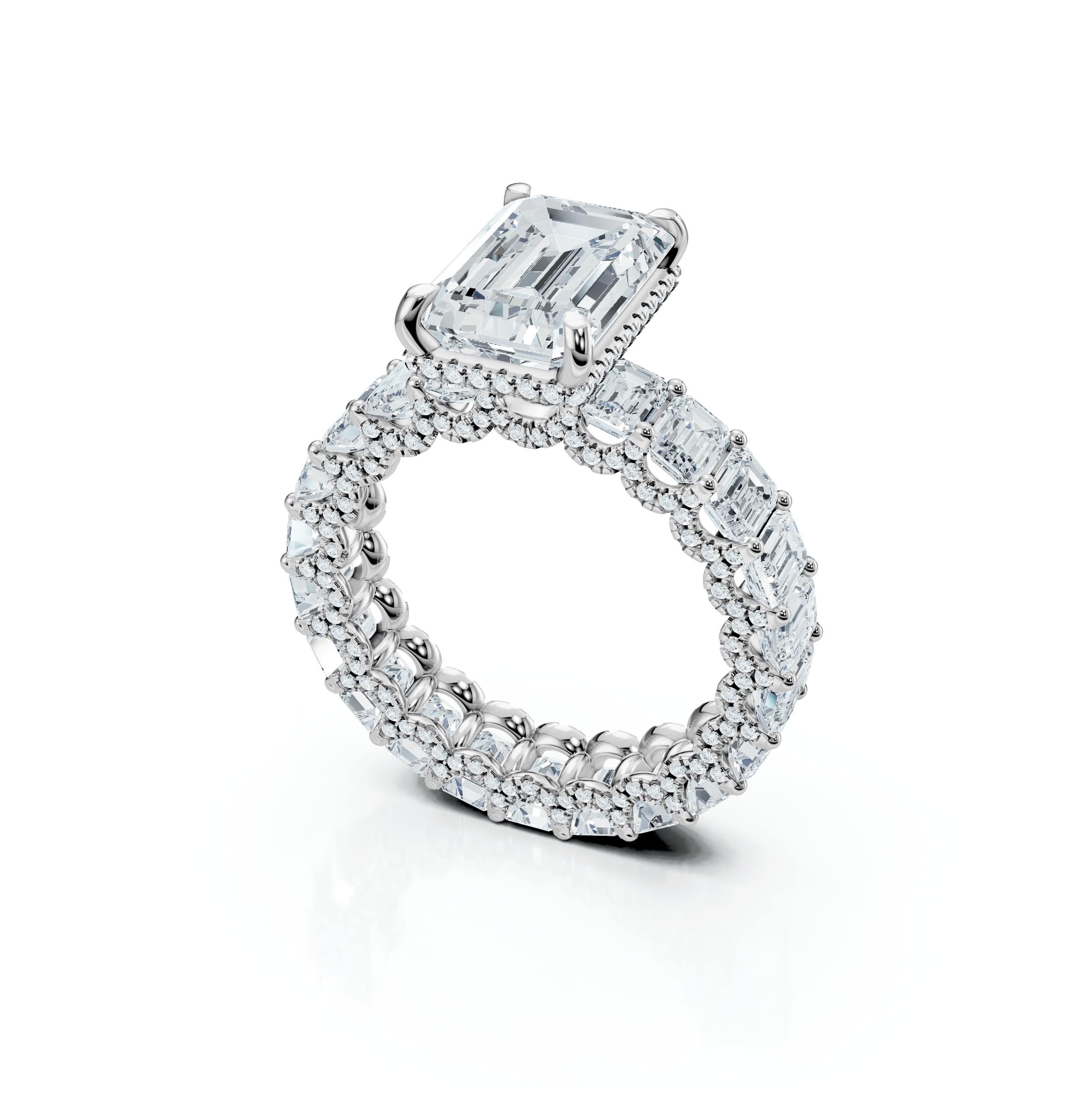 An Emerald-cut centre stone set on the signature Emerald Hibiscus eternity band, with a hidden halo and pavé prongs for timeless brilliance.
