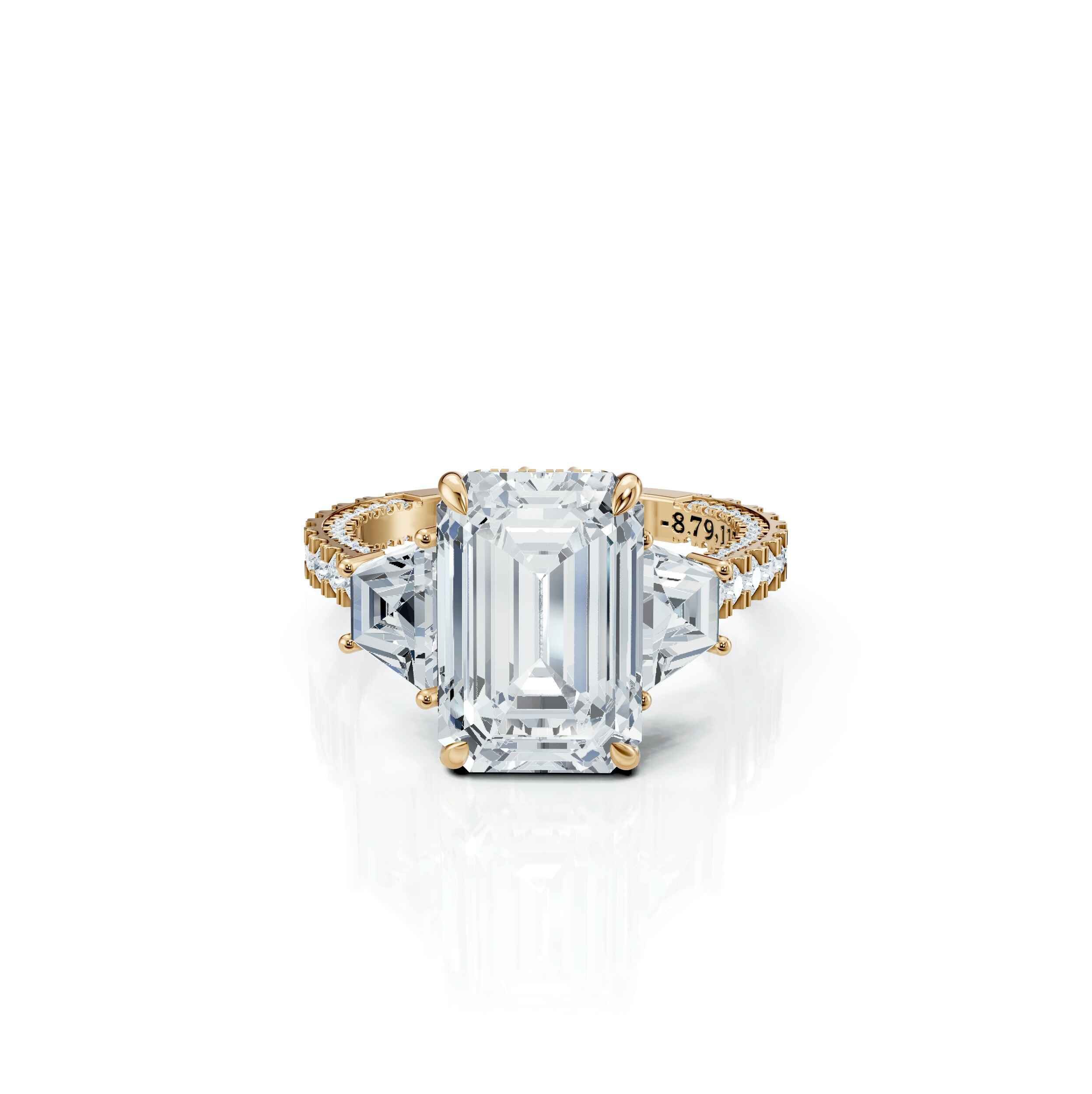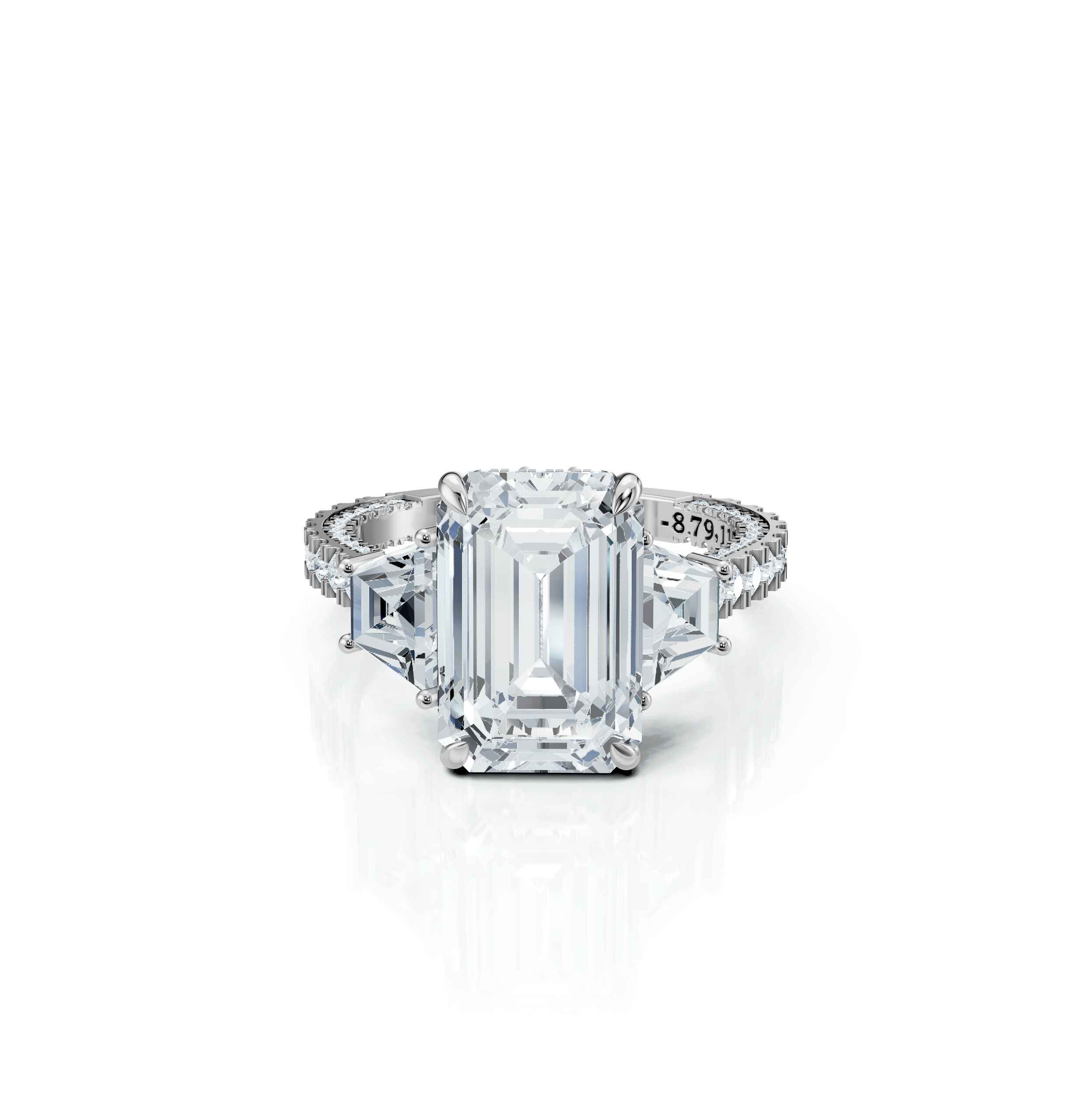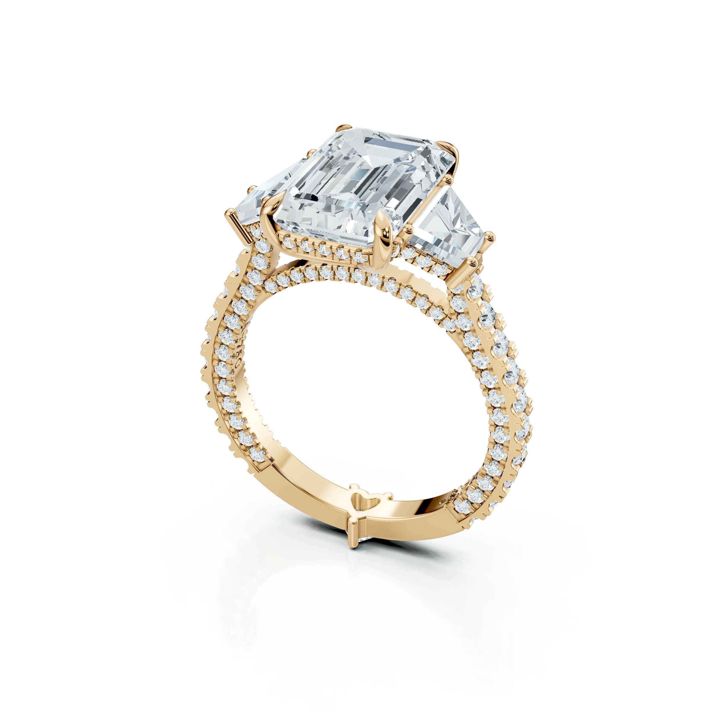 An Emerald-cut centre stone set on the signature Jasmine band, with a hidden halo, pavé prongs, and a trilogy setting accented by step-cut Trapezoid diamond accents and a Heart diamond on the band base for refined elegance.