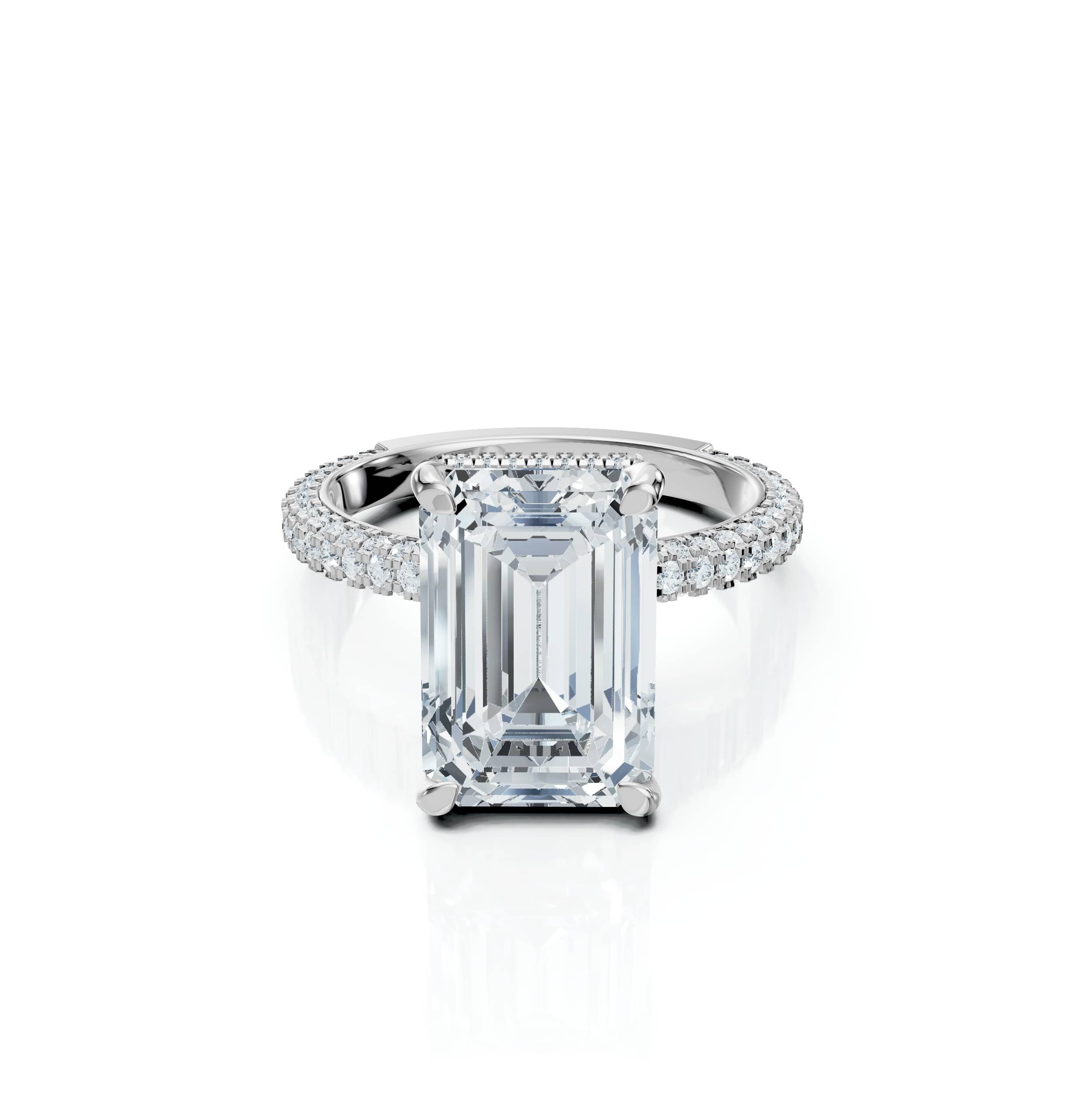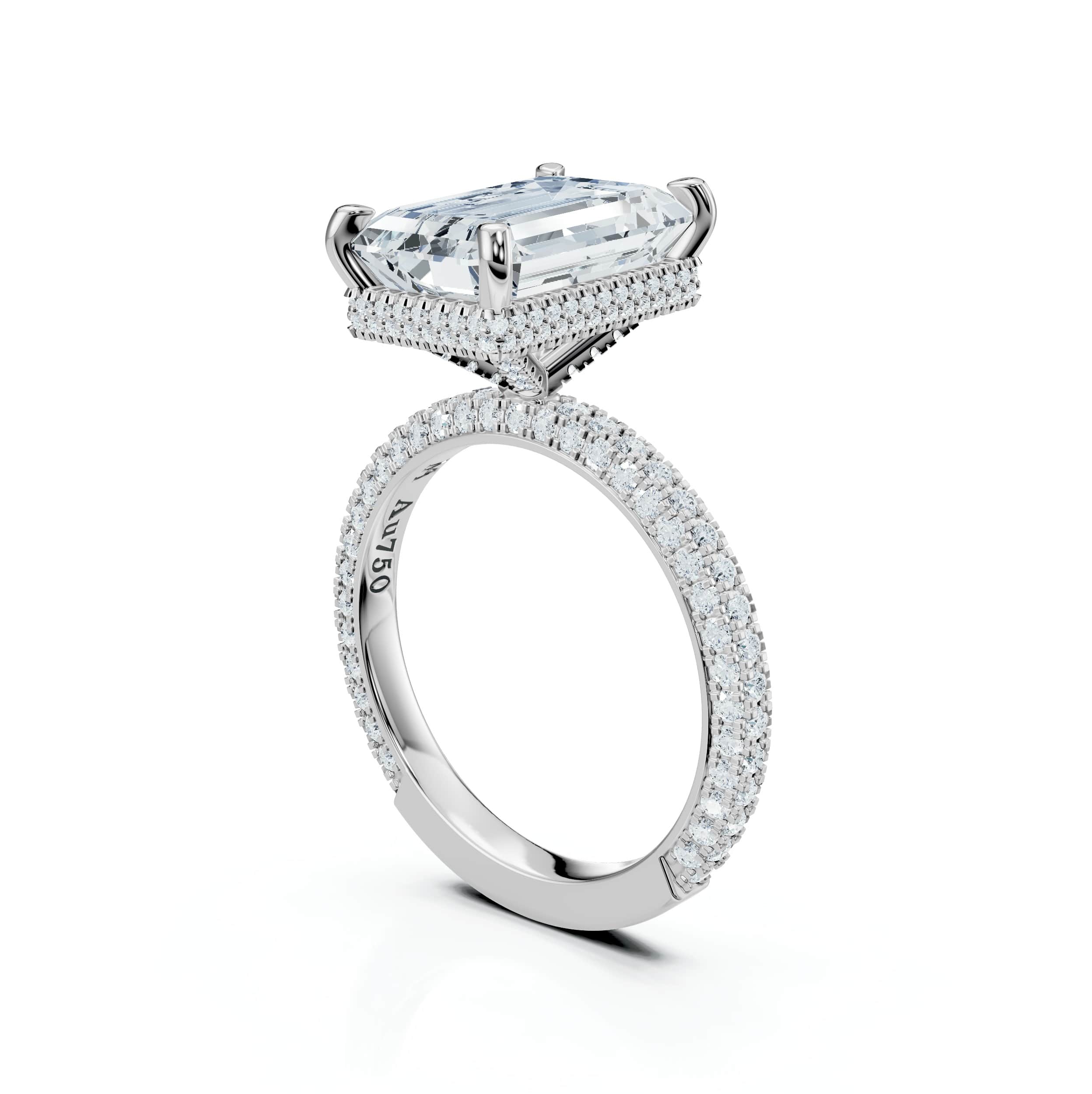 An Emerald-cut centre stone set on the signature Rose micro-pavé band, with pavé prongs and a Twin Whisper Halo for graceful, cushion-like extravagant radiance.