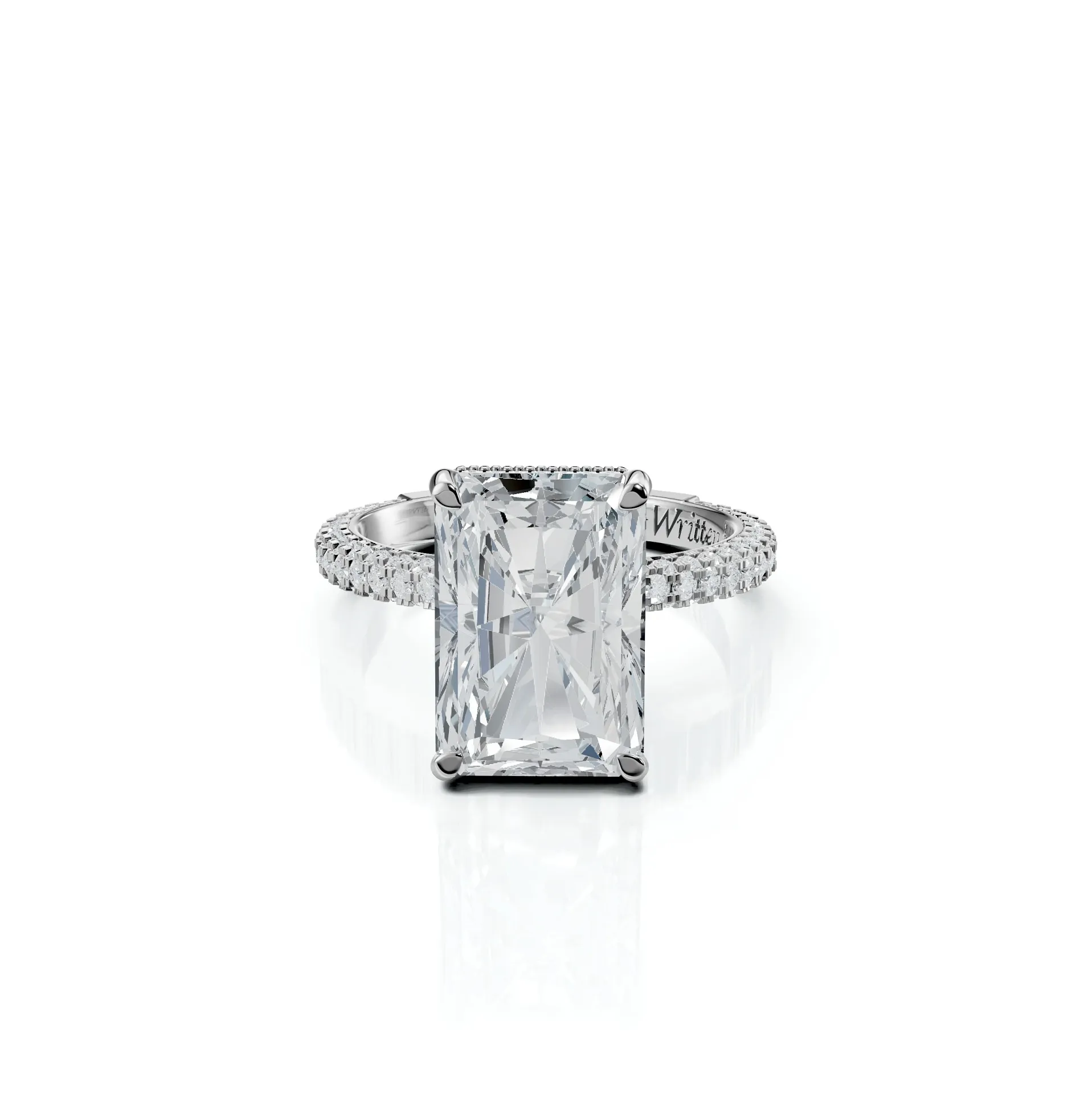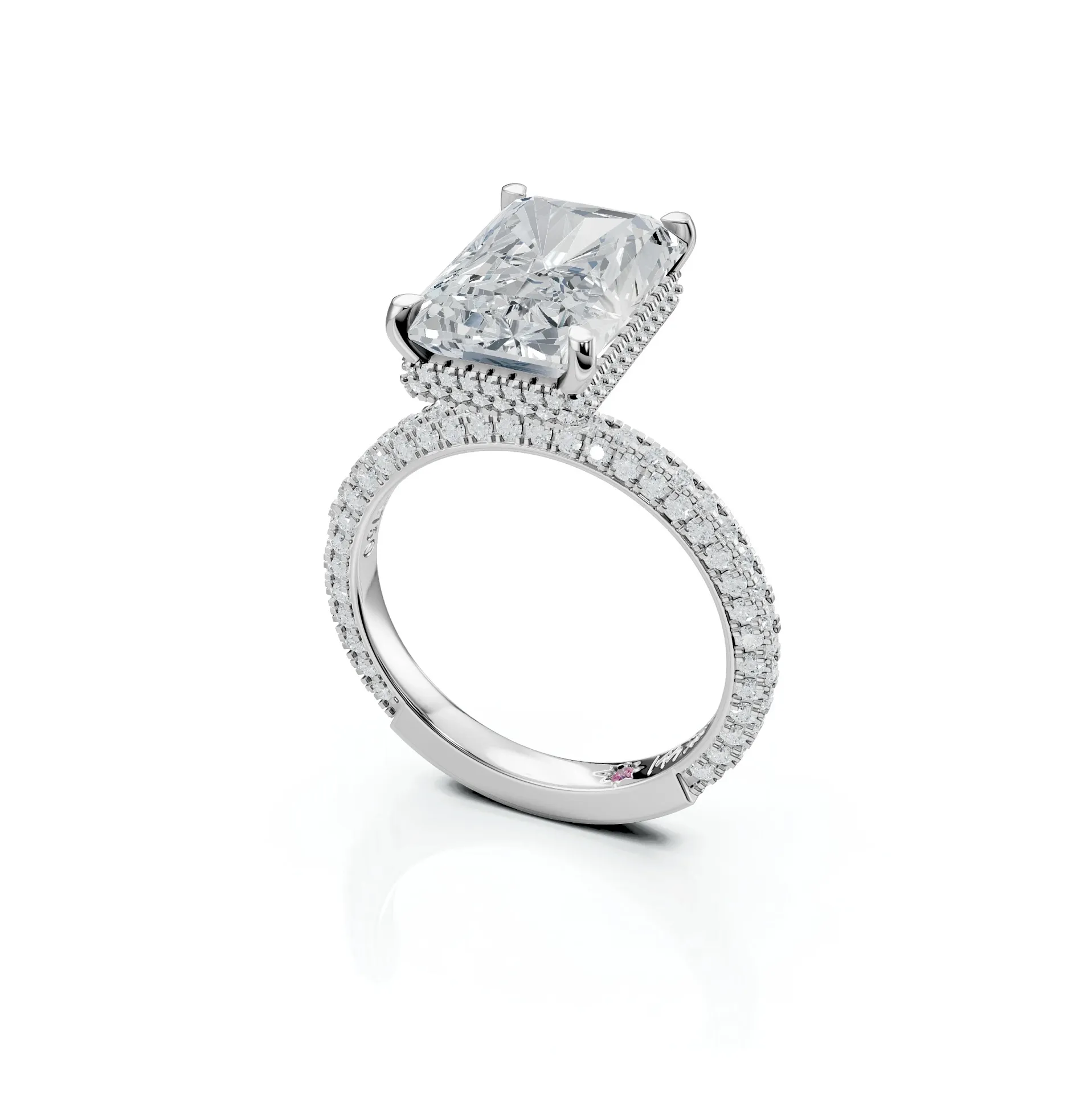 An elegant Emerald-cut centre stone set on the signature Rose micro-pavé band, with a hidden halo and pavé prongs for radiant sophistication.