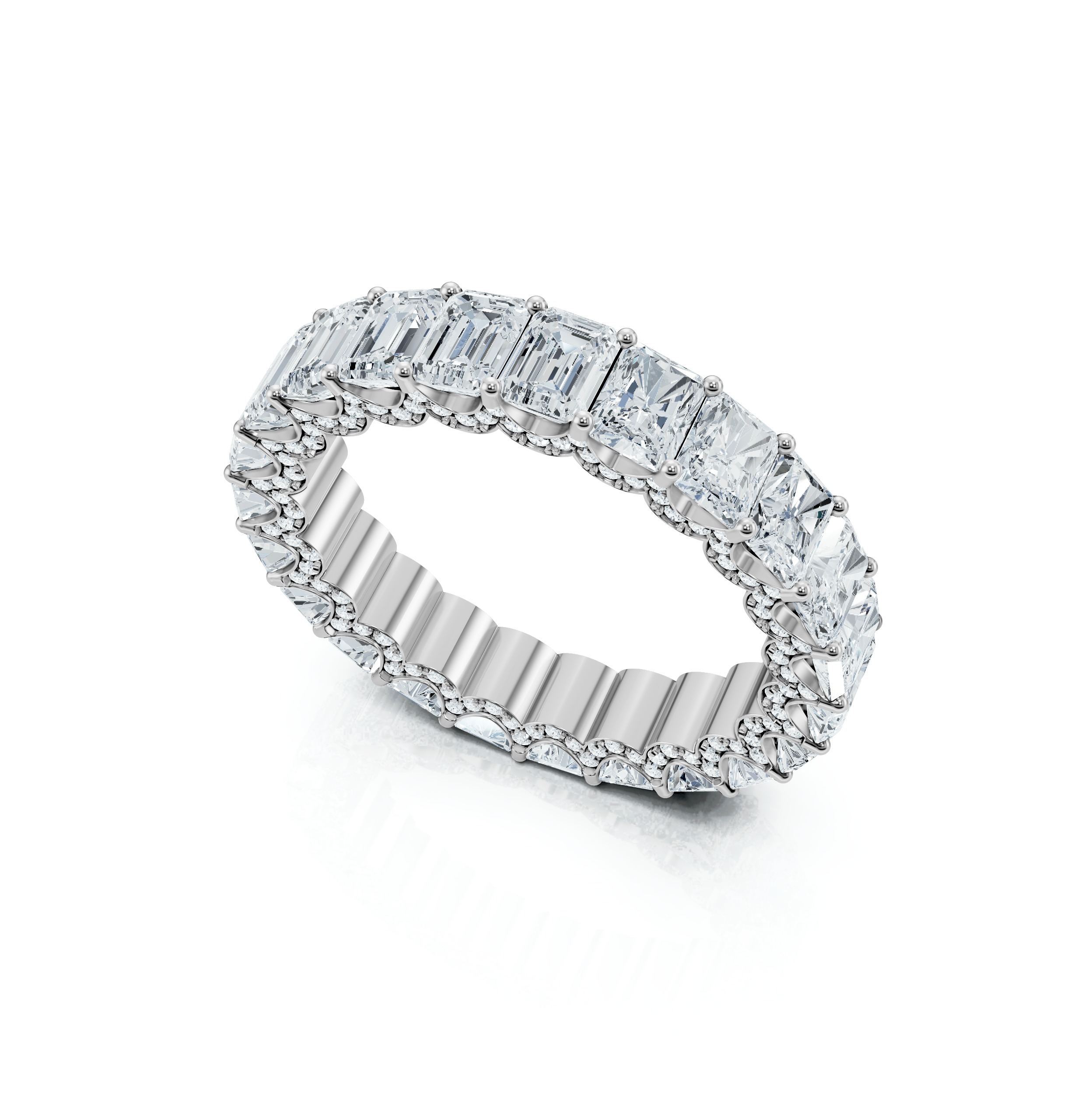 Radiant Diamonds merge the brilliance with a rectangular or square outline, showcasing striking fire and sparkle. Their beveled corners offer exceptional durability and a stylish flair. It is a hybrid shape that combines the faceted style of a round brilliant cut and the step cut of emerald-shaped stones. Typically 70 facets, strategically placed to increase fire and brilliance. Ideal for lively, fashion-forward personalities seeking intense sparkle and brilliance within a versatile shape.