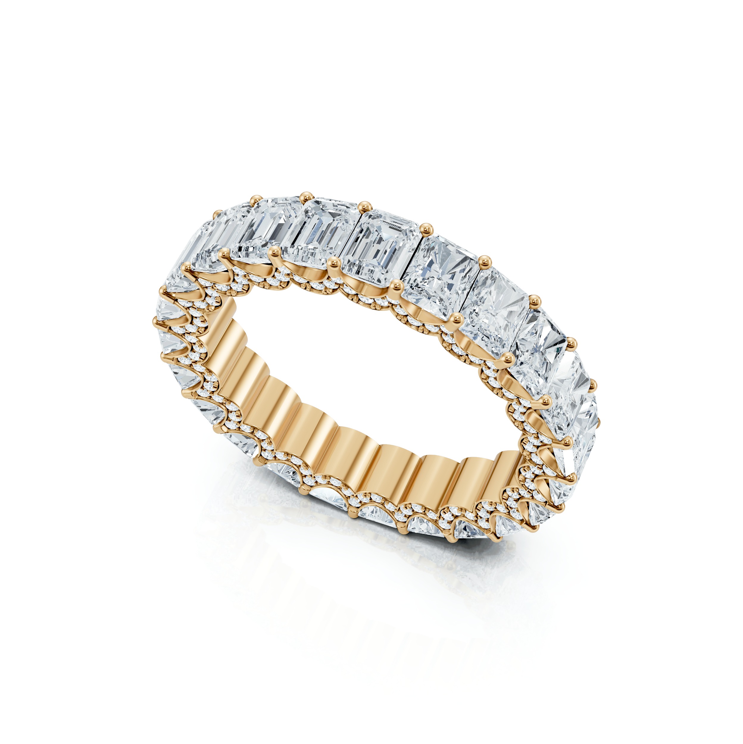 Radiant Diamonds merge the brilliance with a rectangular or square outline, showcasing striking fire and sparkle. Their beveled corners offer exceptional durability and a stylish flair. It is a hybrid shape that combines the faceted style of a round brilliant cut and the step cut of emerald-shaped stones. Typically 70 facets, strategically placed to increase fire and brilliance. Ideal for lively, fashion-forward personalities seeking intense sparkle and brilliance within a versatile shape.