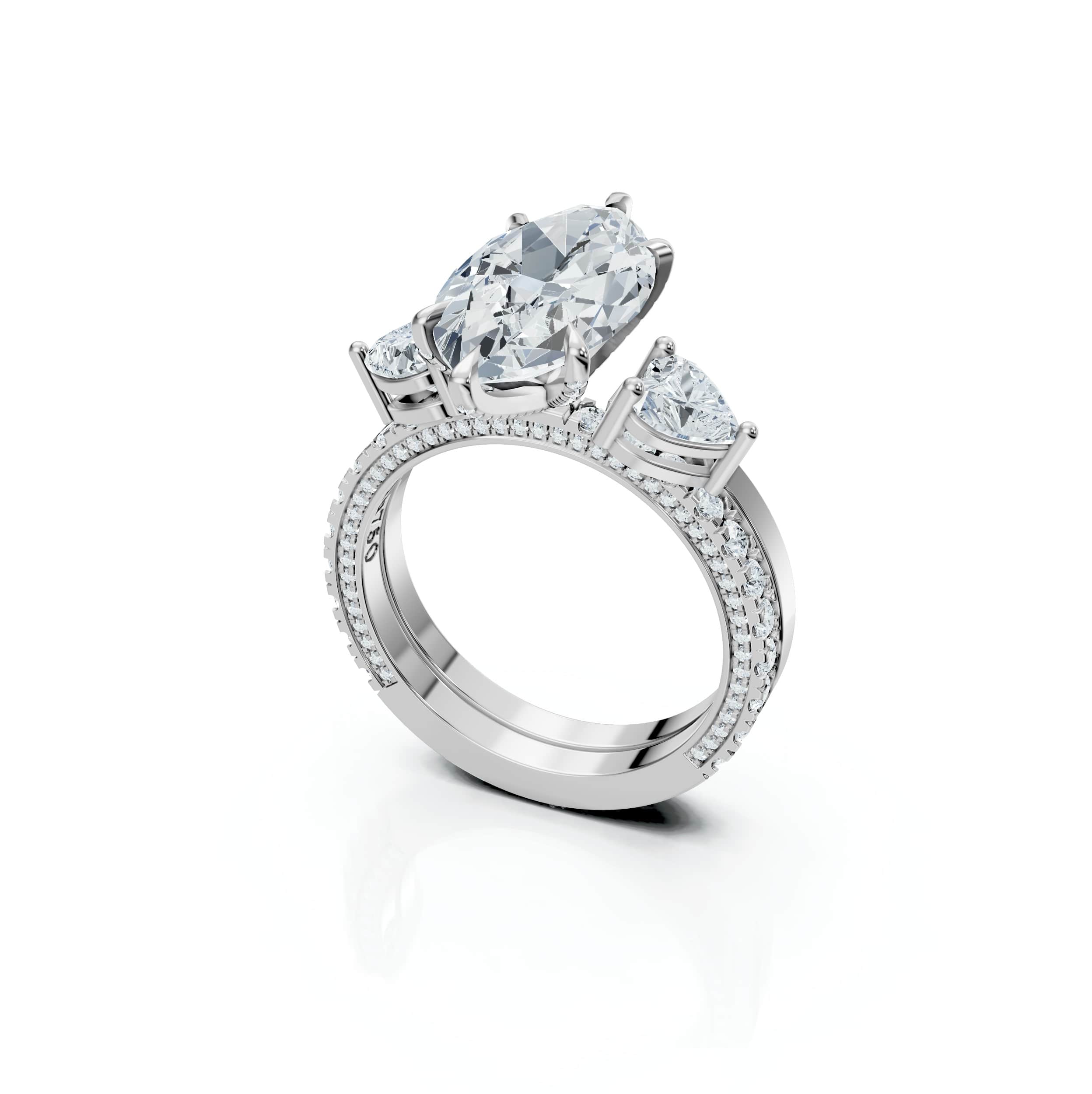 A Marquise-cut centre stone set on the signature detachable trilogy band, with pavé prongs and a detachable trilogy setting accented by Heart diamonds for romantic versatility.