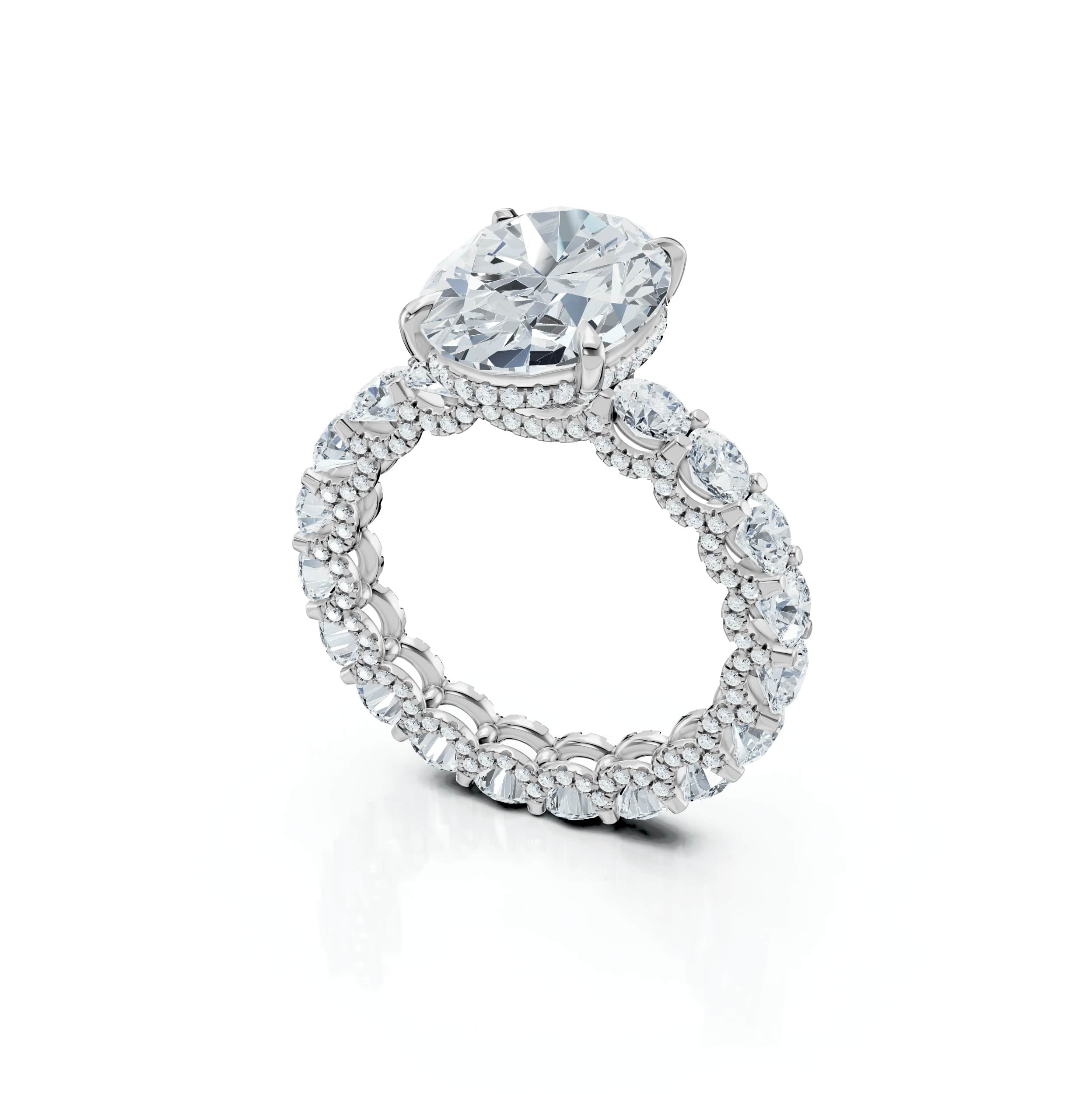 An Oval-cut centre stone set on the signature Hibiscus Round band, with a hidden halo and pavé prongs for blooming brilliance.