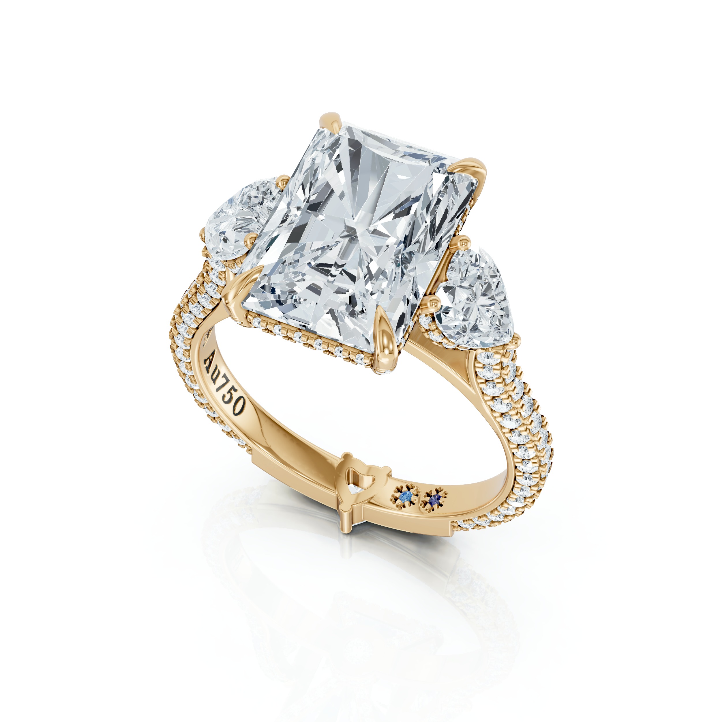 A 4.5 ct Radiant-cut centre stone accompanied by Heart-shaped side diamonds, set on the signature Rose pavé band with delicate detailing for refined brilliance and romantic elegance.