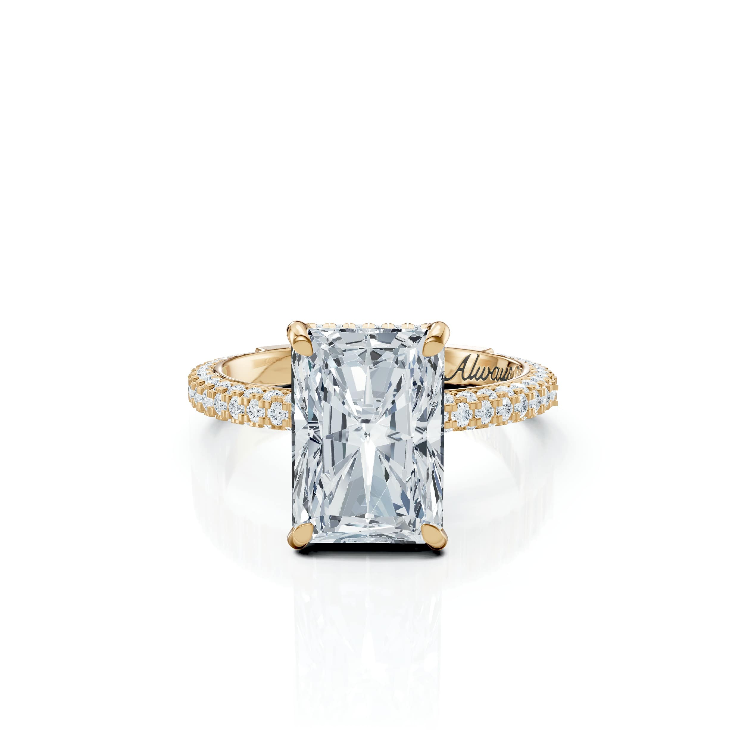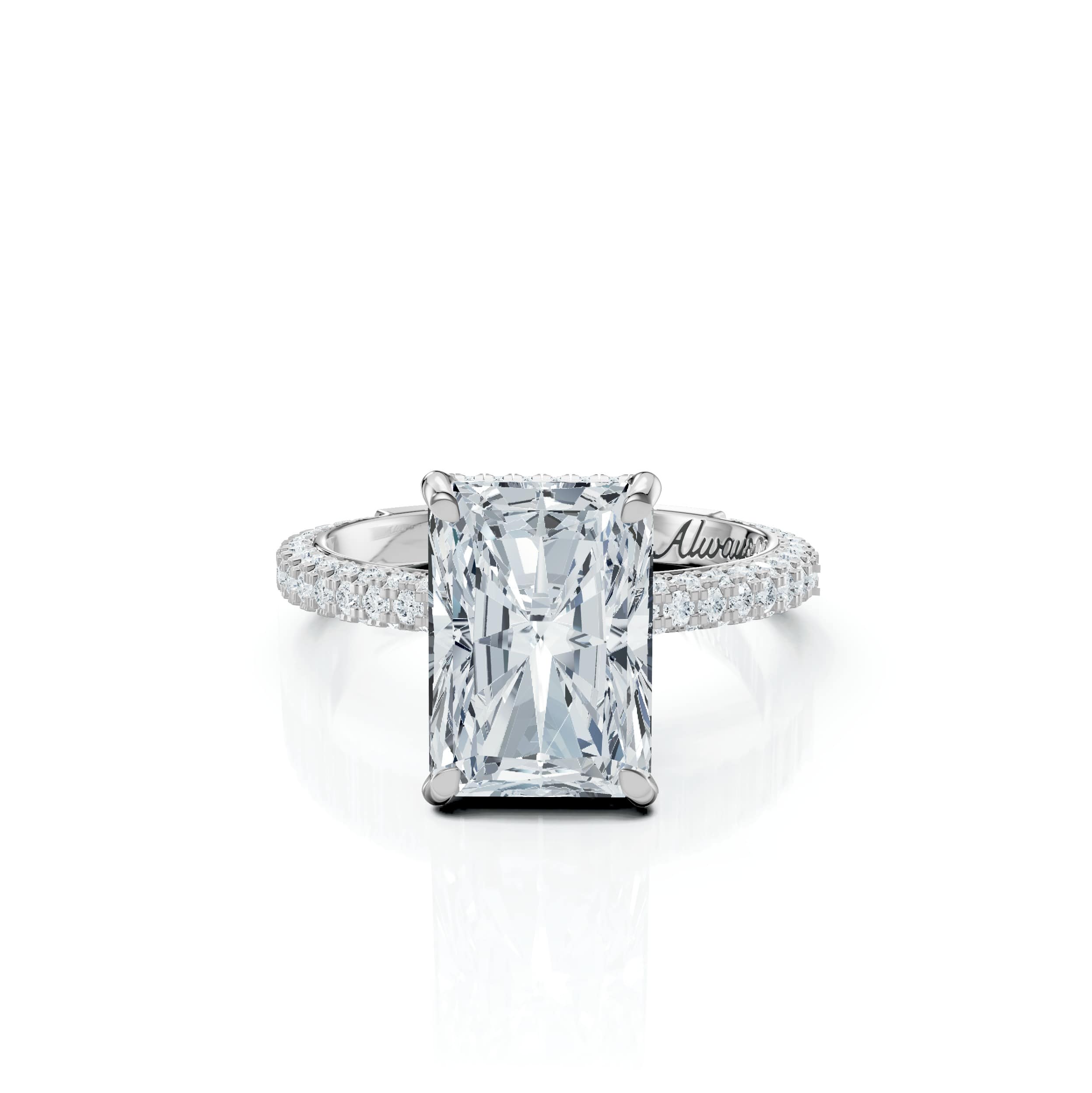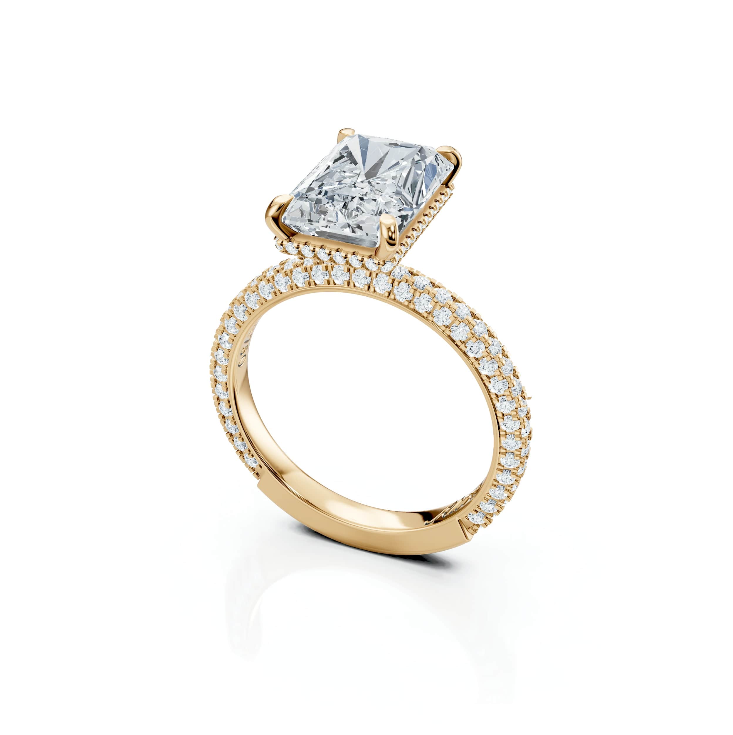 A luminous Radiant-cut centre stone embraced by a Rose micro-pavé band, hidden halo, and pavé prongs for timeless brilliance.